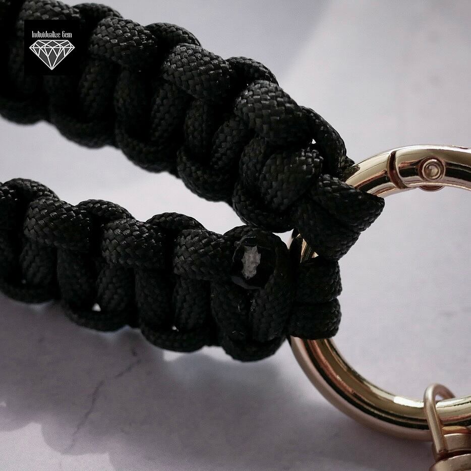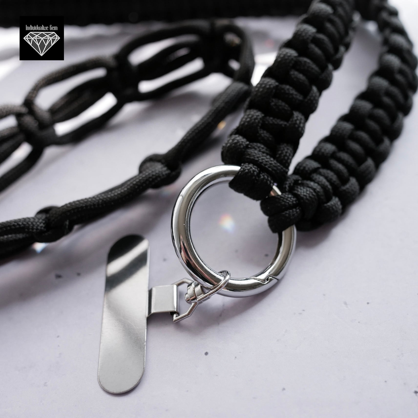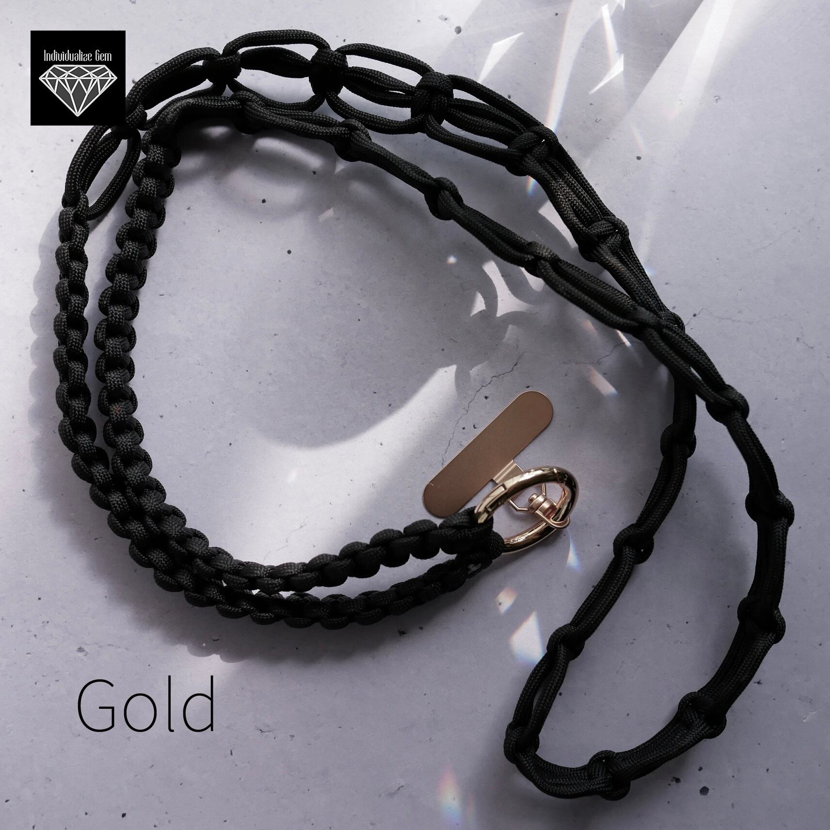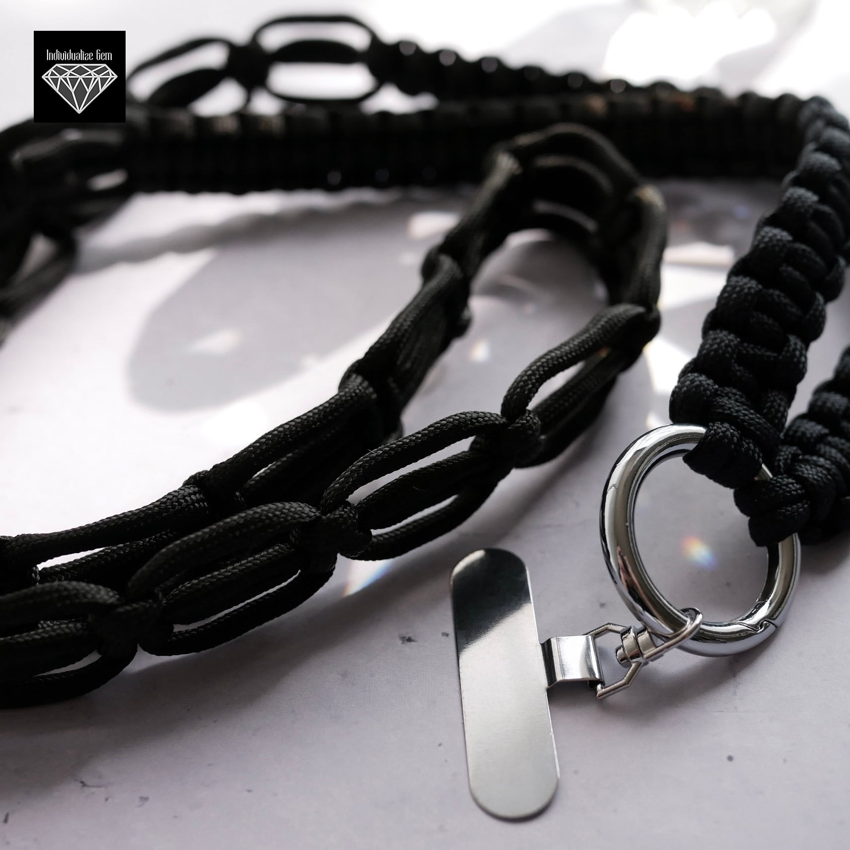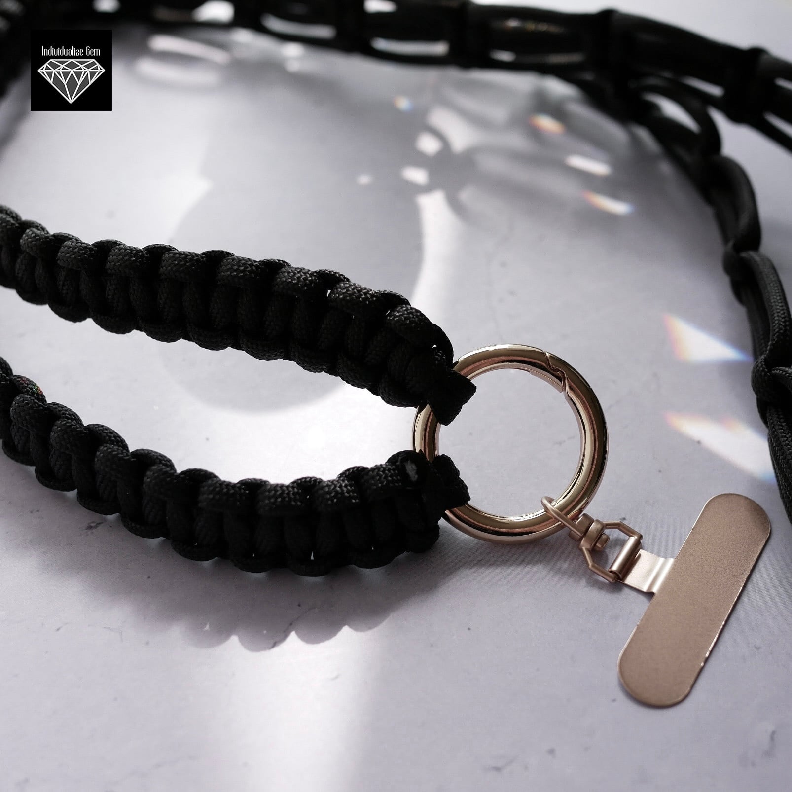 スタイリッシュなブラックの編み込みコードを使用した、ハンドメイドのスマホストラップです。